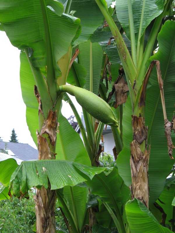 Aktuelles Foto von heute Abend der voranschreitenden Bananenblüte bei meiner /*Musa basjoo*/, die sich bei dieser Witterung nun sicherlich verlangsamen wird.