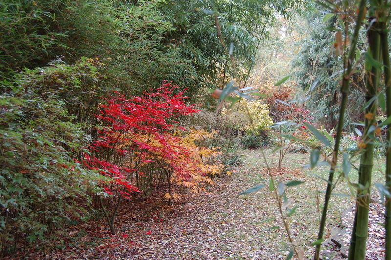Auch bei trübem Licht kann man sich dem "asian feeling" nicht entziehen!, hier leuchtet rot:/*Acer palmatum Tsuma Beni*/ und gelb /*Acer palmatum Aka Shigatatsu Sawa*/. Hinten ebenfalls knallgelb: Chionanthus virginicus. Vorne re Phyllostachys violascens