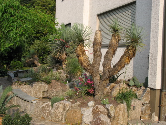 Hier steht er nun, der "Krüppel". Im Grunde verdanke ich diese Pflanze hier dem Forum. Irgentwer hatte im Frühjahr 04 Bilder aus Holland eingestellt. Da stand diese Pflanze einsam und ohne Topf an die Heizungsrohre des Gewächshauses geleht und ich dachte sofort: die ist perfekt für die Ecke des Xerophytenbeetes. Ich habe mich mit dem Anhänger auf den Weg gemacht und weil ich mich bei all diesen verrückten Pflanzen nicht entscheiden konnte ..., wurdens ein paar mehr.