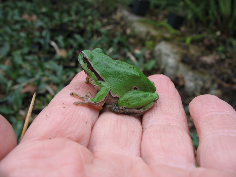 Wen haben wir denn da!! Vorhanden sind sie hier am Mittleren Oberrhein immer. Sehen tut man sie fast nie, hören im Sommer schon. Aber ab und an ganz unverhofft wenn man mit der Hand durchs Grün fährt, oder wie heute durchs alte Falllaub zwischen meinen Rohdeas, hat man so einen Burschen zwischen den Finger hängen - und bekommt meist erstmal einen kleinen Schreck.