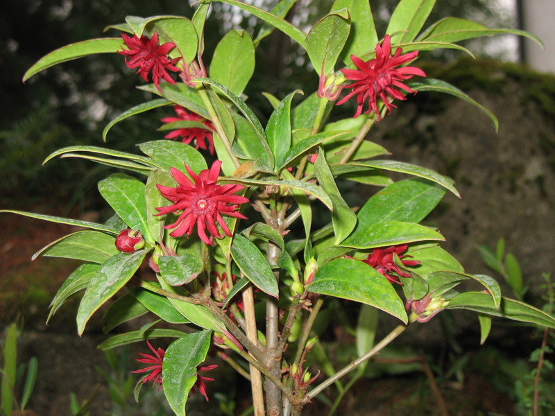 ein richtiger Hingucker ist /*Illicium floridanum*/. Diesen Sternjasmin habe ich diese Woche in meiner Baumschule vor Ort entdeckt und konnte ihn unmöglich stehen lassen. Bereits vor 2 Jahren hatte ich diese Art bei Eisenhut erworben, nur scheint mir jene Pflanze nicht ganz "echt" bzw. farbecht. Sie blüht blaß durchscheinend weiß - eigentlich gar keine Farbe!