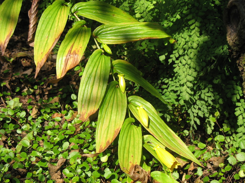 eher eine Seltenheit bei uns ist Tricyrtis macrantha aus Japan mit einzelnen sehr großen glockenförmigen Blüten an langen bogenförmig überhängenden Trieben, welche gerade mit der Blüte beginnt - über Muehlenbeckia complexa und dem bekannten Zimmerfarn Adiantum raddianum (bei mir im Garten bereits 2 Winter überstanden)