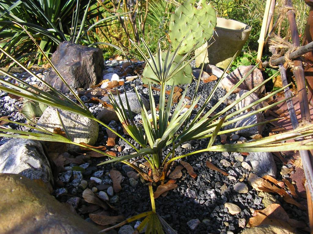 kleine Chamaerops hum. cerifera ebenfalls vor dem zweiten Winter, dahinter Opuntia engelmannii
