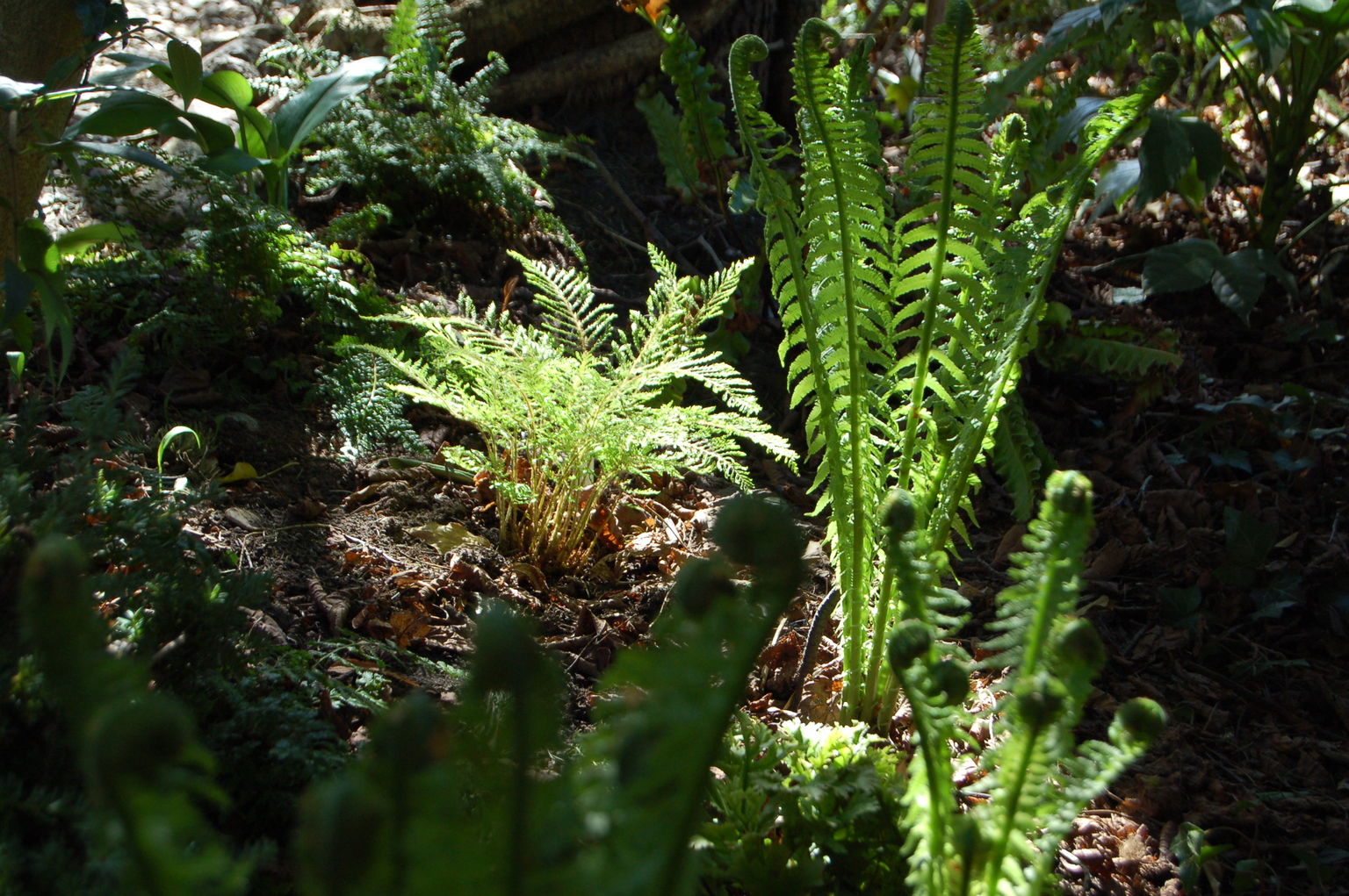 neben Matteuccia struthiopteris leuchtet intensiv hellgrün der zarte Polystichum setiferum Lineare#AM