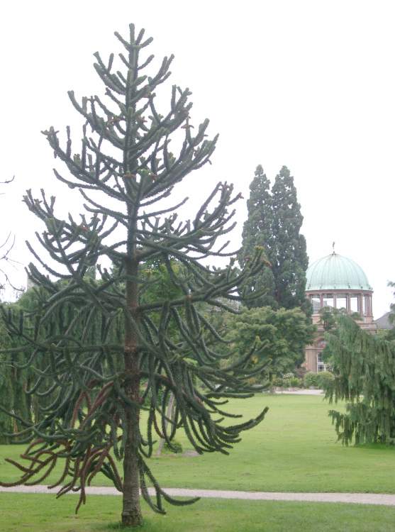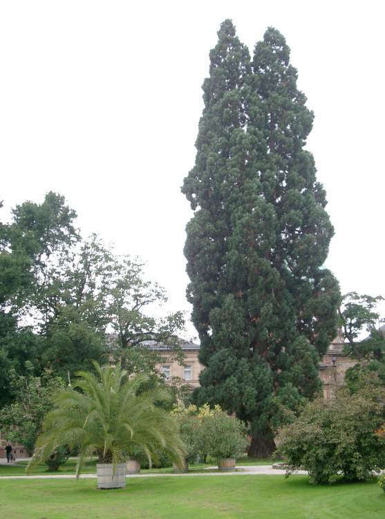 Hinter der Phoenix ein großer Mammutbaum mit zwei Spitzen. Der kleine Baum rechts neben dem Mammutbaum ist übrigens der Sassafras von vorhin.
