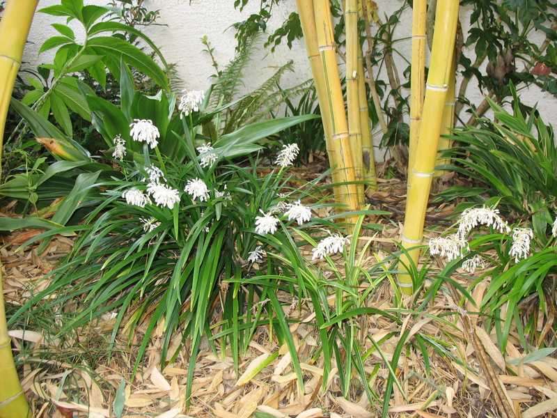 Der große Schlangenbart /*Ophiopogon jaburan*/ blüht als Unterpflanzung von Phyllostachys sulfurea jetzt schon seit Wochen. Auch nimmt die Pflanze langsam an Größe zu, seit ich ihr den warmen Standort auf der Südseite gegeben habe.