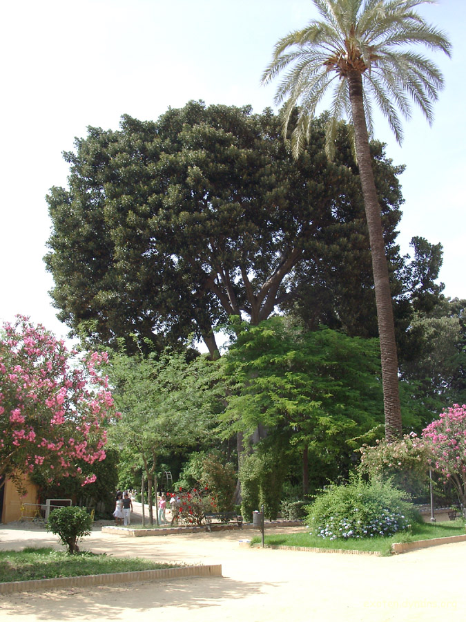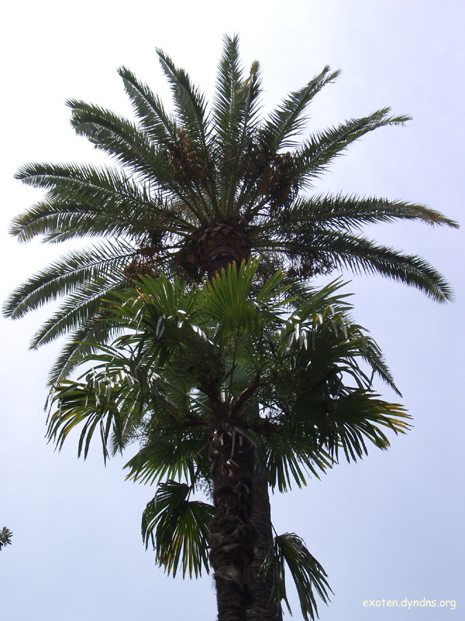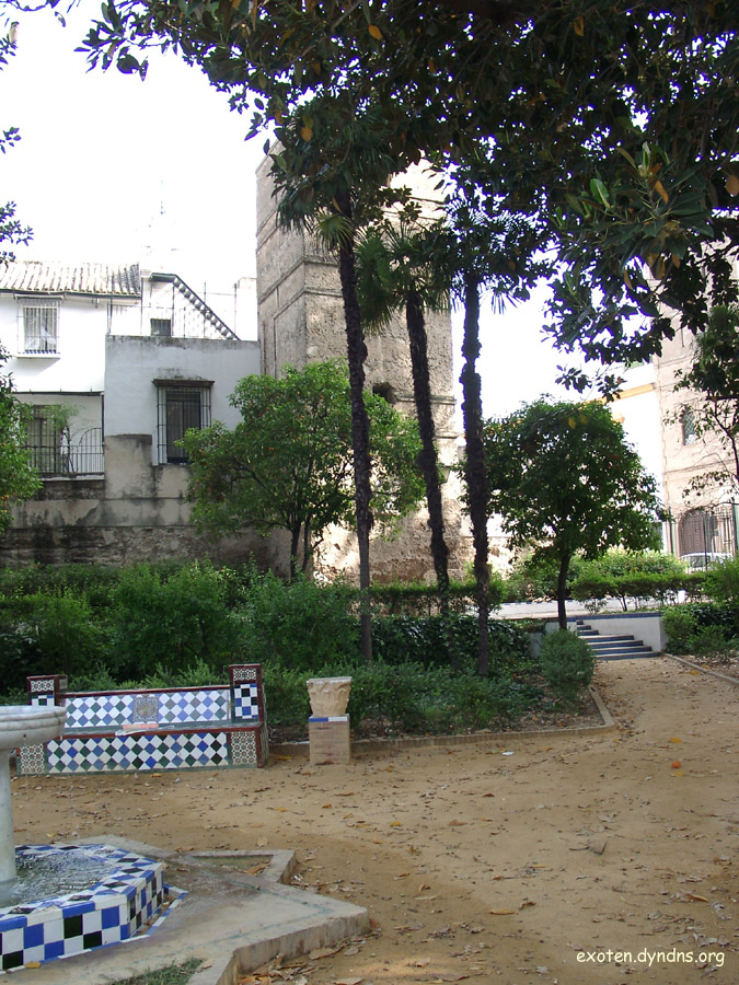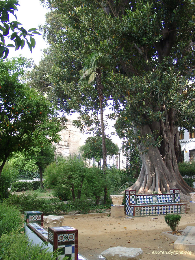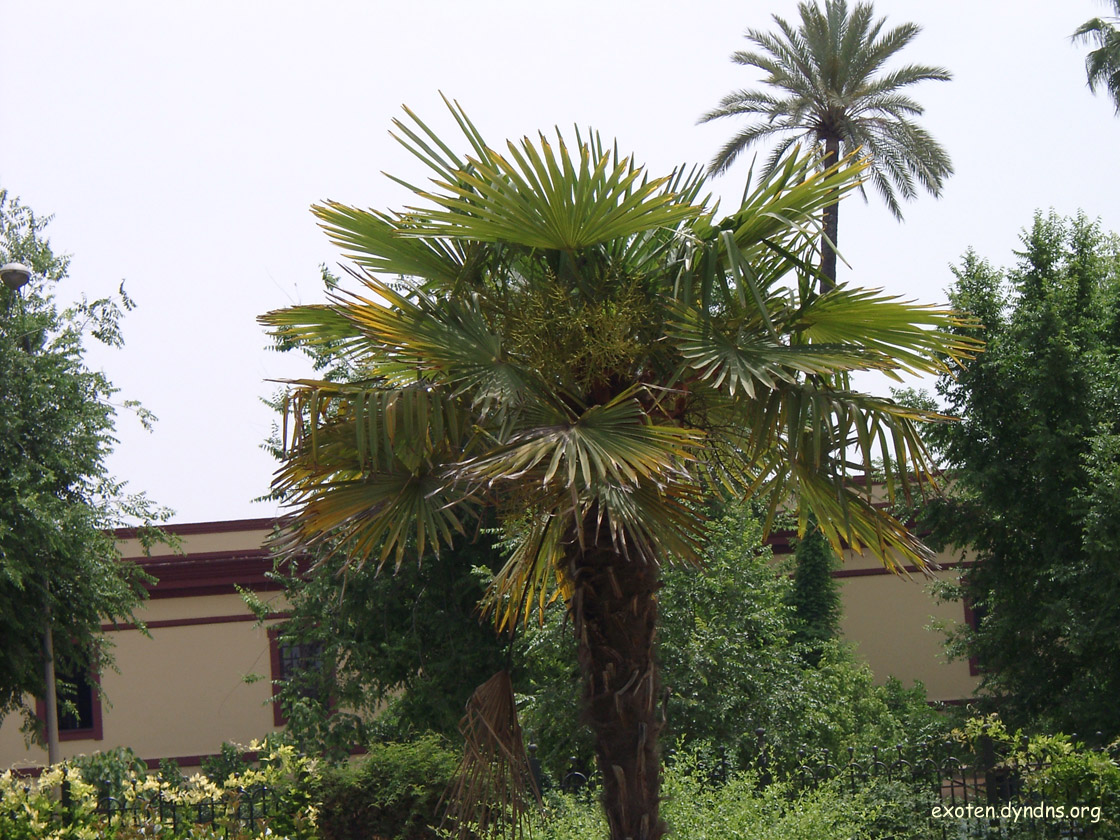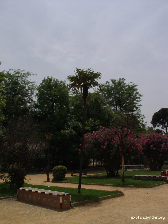 /*Livistonia chinensis*/ sieht man in Sevilla durchaus öfters, sie kommt mit dem Klima dort gut zurecht. Bei flüchtigem Blick kann man sie leicht mit Washingtonia verwechseln, untrügliches Zeichen sind u.a. die innerhalb der Krone liegenden Blüten/Fruchtstände. Die Livis trugen schon Fruchtansatz, während die Washis erst blühten