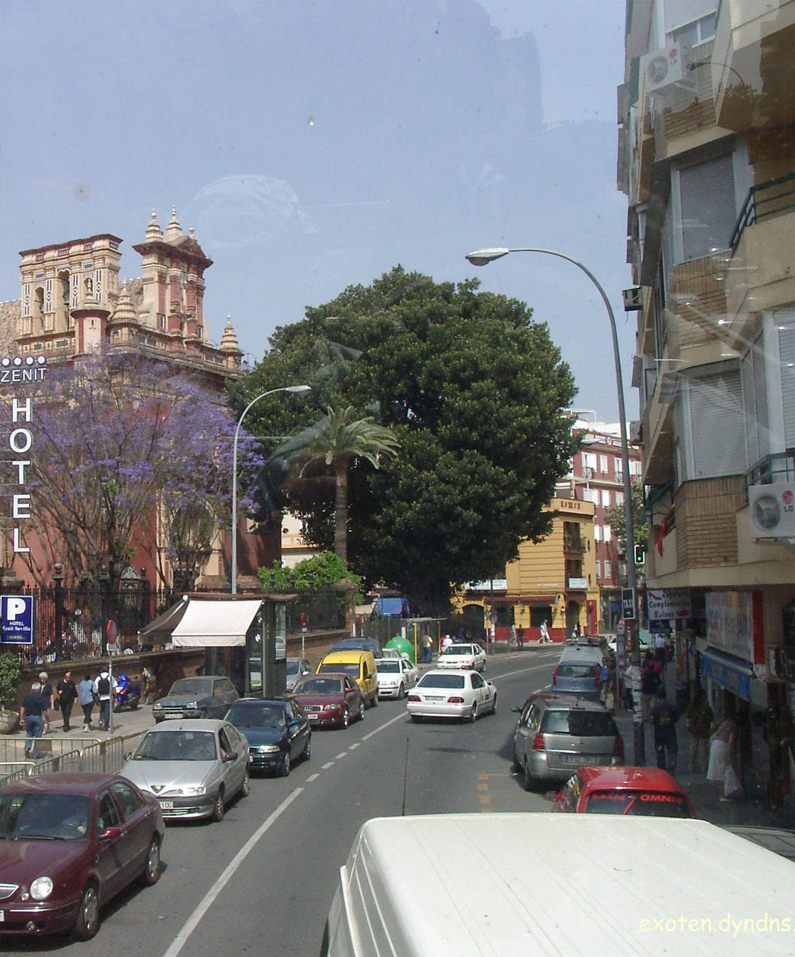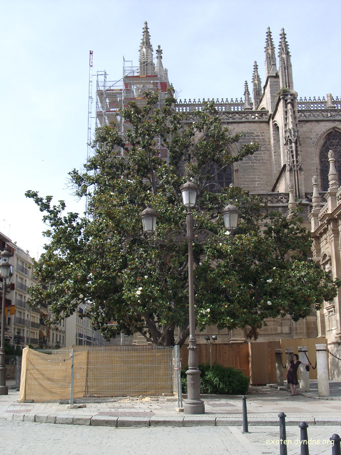 Vor der Kathedrale eine Magnolia grandiflora. Man sieht hier ein allgemeines Problem in Andalusien: überall wird gebaut oder restauriert, und manch geniale Perspektive wird durch Bauzäune, Schuttcontainer, Kräne etc. verschandelt.