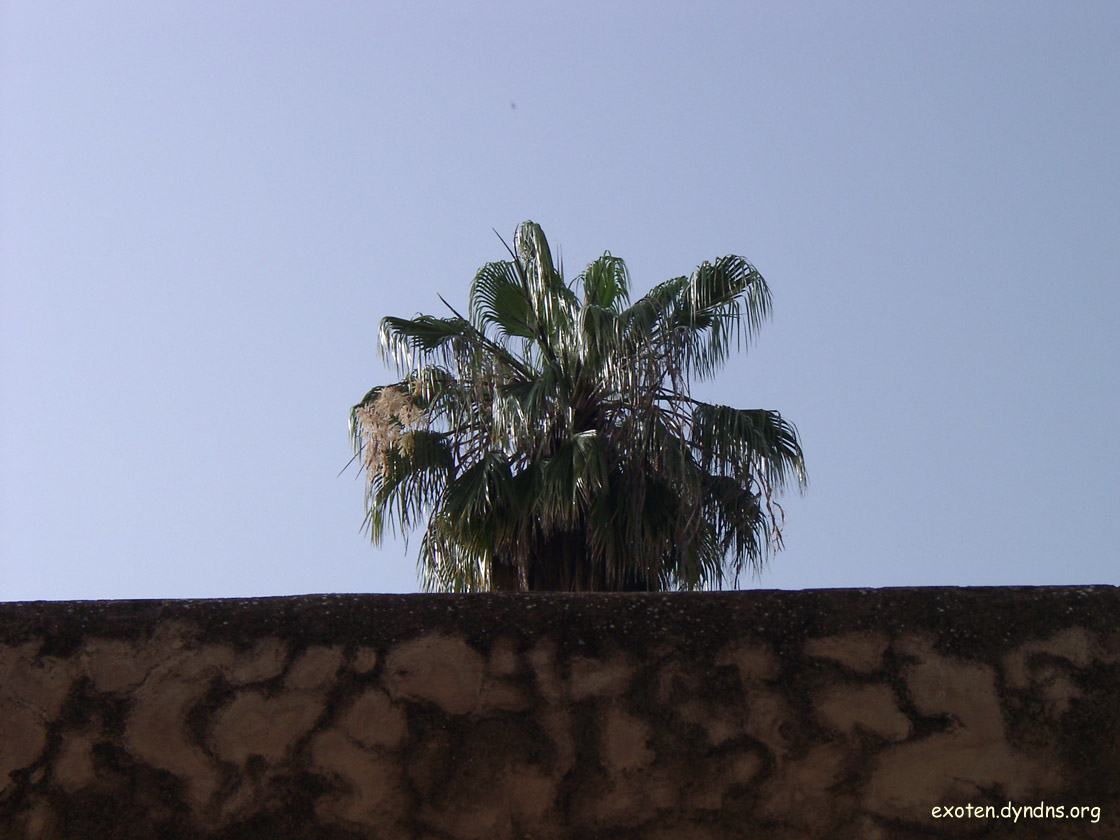 Über die hohe Mauer "spekuliert": blühende Washingtonia robusta