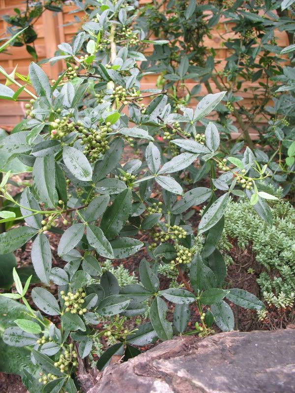 Der immergrüne Pefferbaum biegt sich auch hier unter der Früchte Last. Er mußte das letzte Jahr und den Winter im Kübel verbringen, da mir schnell bewusst wurde, das er auf der Südseite zu groß wird (Schattenwurf!!!) und so hatte ich ihn gegen Citrus ichangensis ausgetauscht. Auch das Umpflanzen der Bananen von Süd nach Nord hat dem Garten ungemein gut getan!