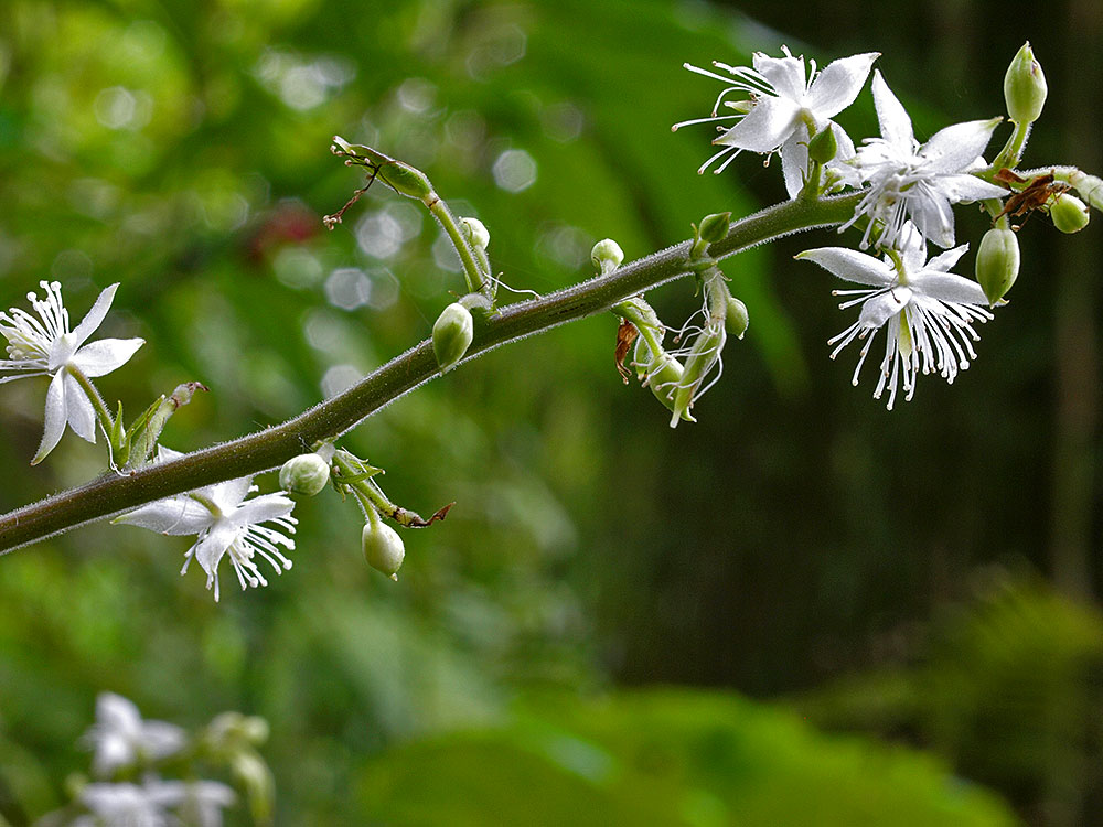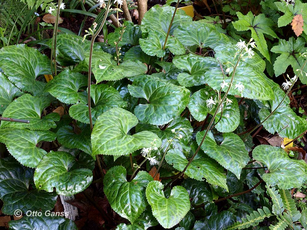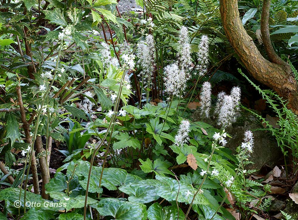 Dazu passend an der gleichen Stelle, /*Heucherella 'Iron Butterfly'*/ blüht seit 2 Wochen.Rechts das Stämmchen von Quercus x kewensis.