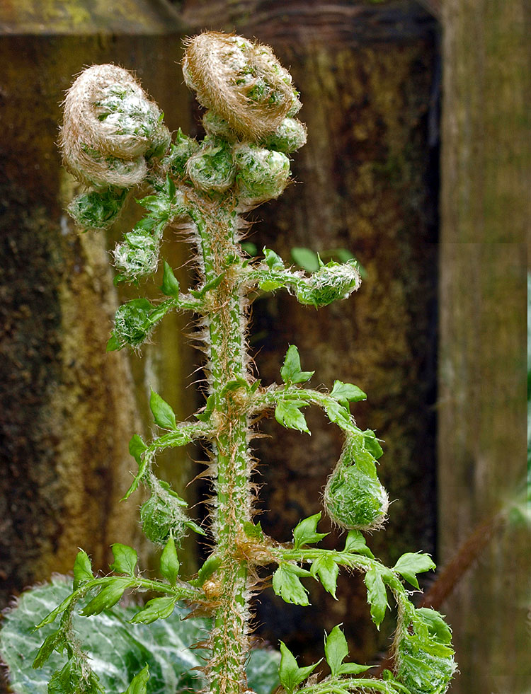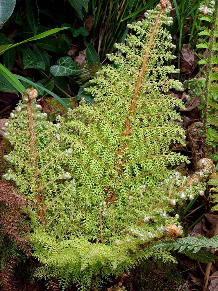 /*Polystichum setiferum 'Capitatum'*/ sieht lustig aus im Austrieb,spater entwickelt sich der geteilte Wedel.
