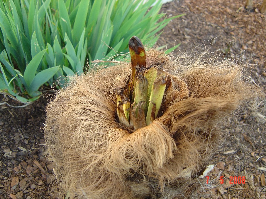 Inzwischen habe ich auch die restlichen Blätter entfernt. In der Mitte des Lochs konnte ich schon seit ein paar Tagen etwas Hartes spüren. Dann schiebt sich die Spitze eines abgefaulten Stängels nach außen. Hoffnung keimt auf!