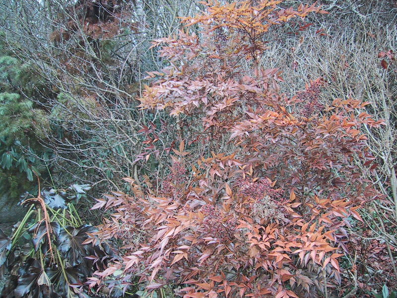 meine 25j alte Nandina komplett erfroren, li daneben Fatsia hinten Cunninghamia (unterer etwa 1m hoher Anteil, der im Schatten lag noch grün,die restlichen 3m darüber trocken!!!!