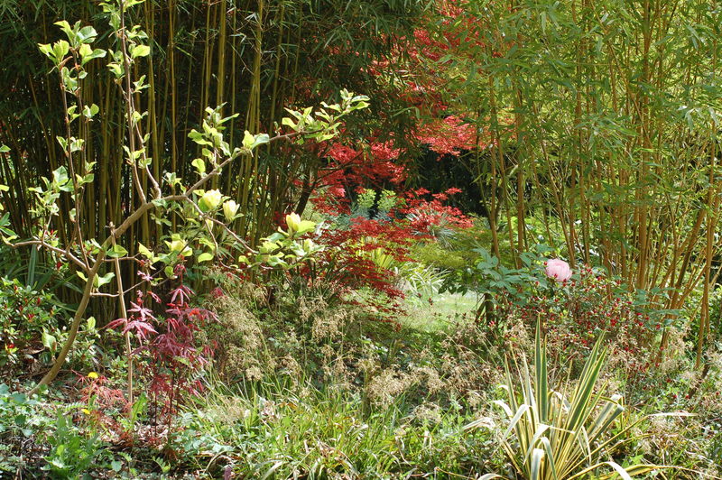 /*Magnolia 'Yellow Bird"*/ und eine Paeonia suffr. Hybride zieren Fargesia robusta und Phyllostachys bamb.Castillonii