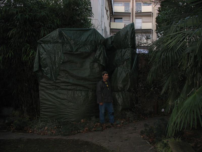 am Abend geschafft! Alles mit Gewebeplanen abgedichtet. Zur Sicherheit oben mit einer zweiten kleineren Plane, also ingesamt 4 Planen. Wegen der ausuferden Größe sind inzwischen 2 getrennte Stellagen nötig.