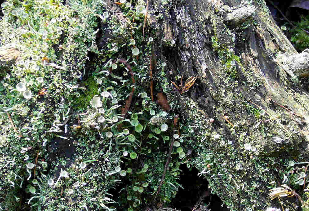 ... im Heidegarten wurde aus Dekorationszwecken und wegen einiger Kleintiere ein Stück eines Baumstamms eingebracht, das nunmehr mit einen besonderen Schmuck versehen ist. Es sind vor allem Flechten, darunter die Becherflechte /*Cladonia pyxidata*/. Auch an solchen stillen Gartenschönheiten kann man sich erfreuen.