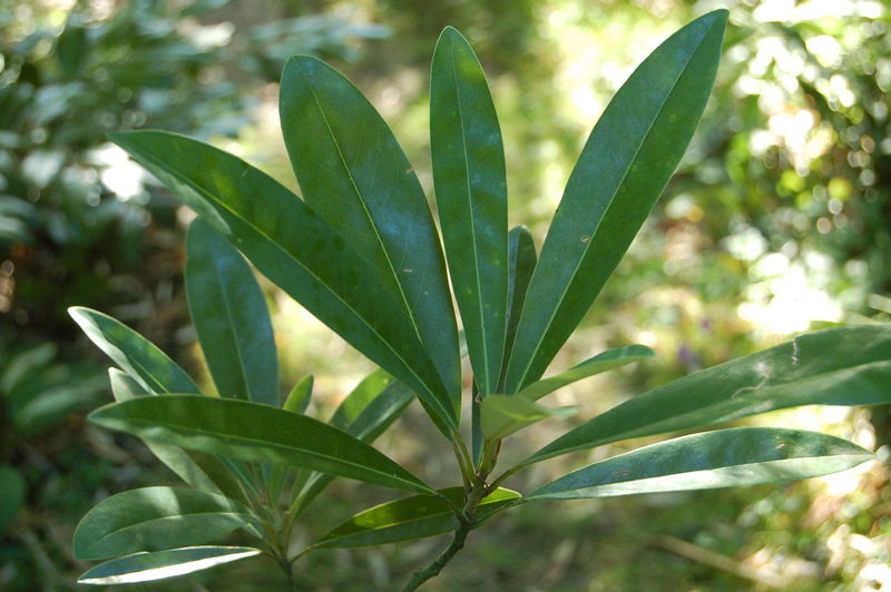 Ebenfalls sehr dekorativ wirken die schmalen Blätter von /*Magnolia viginiana*/ mit ihrer hellen, fast weißen Blattunterseite