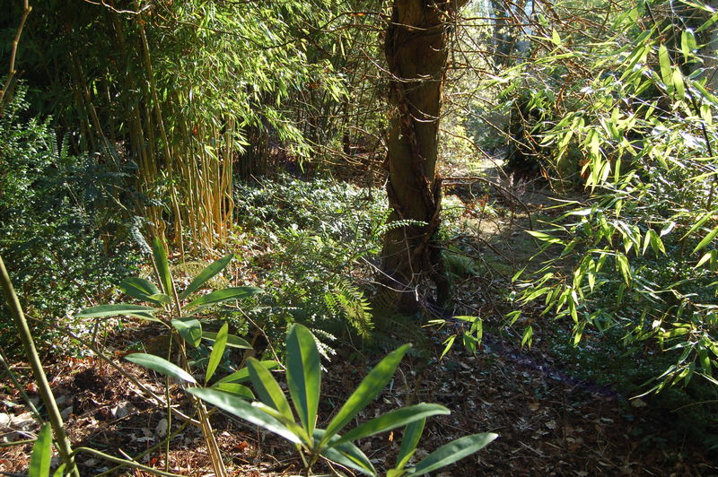 /*Phyllostachys aureosulcata spectabilis */ li ,mittig Sophora microphylla ,re Phyl. nigra nigra und vorne Magnolia virginiana