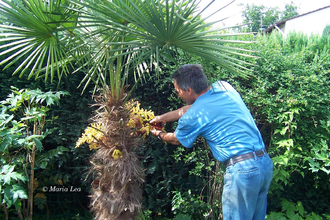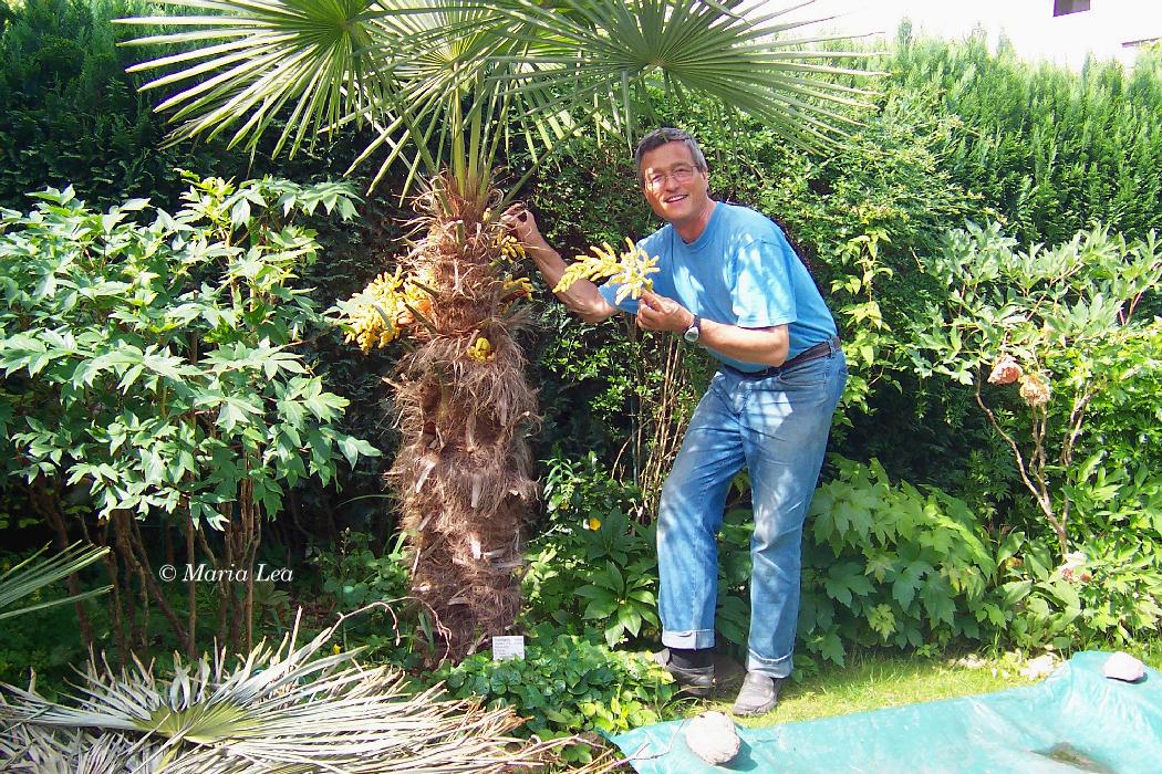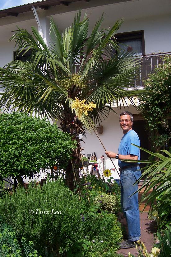 am vergangenen Sonntag habe ich das schöne und trockene Wetter genutzt und unsere weibliche Trachy an der Terrasse mit dem reifen Pollen/Samen der männlichen "Riva-Trachy" zu bestäuben.