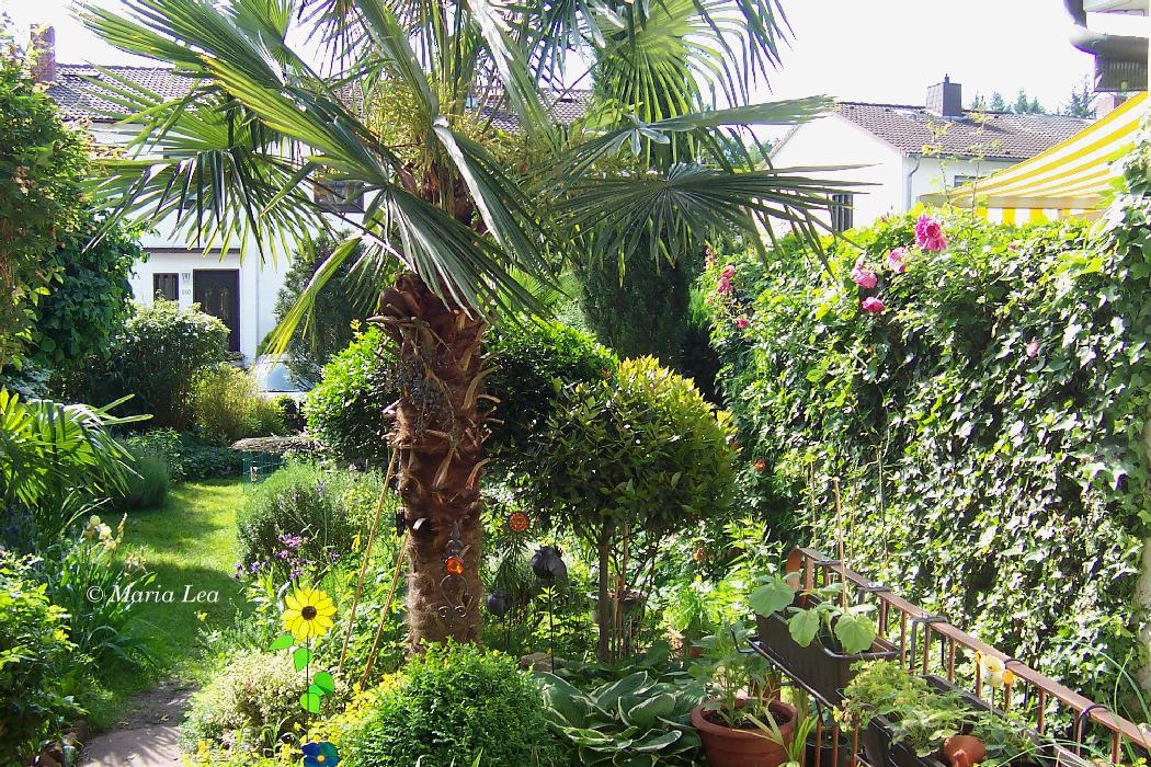 Hinter der Trachy von links kräftige Exemplare von 'Rosmarin officinalis' (seit 2004), 'Poncirus trifoliata' (seit 1992). und 'Laurus nobilis' (seit 1992).