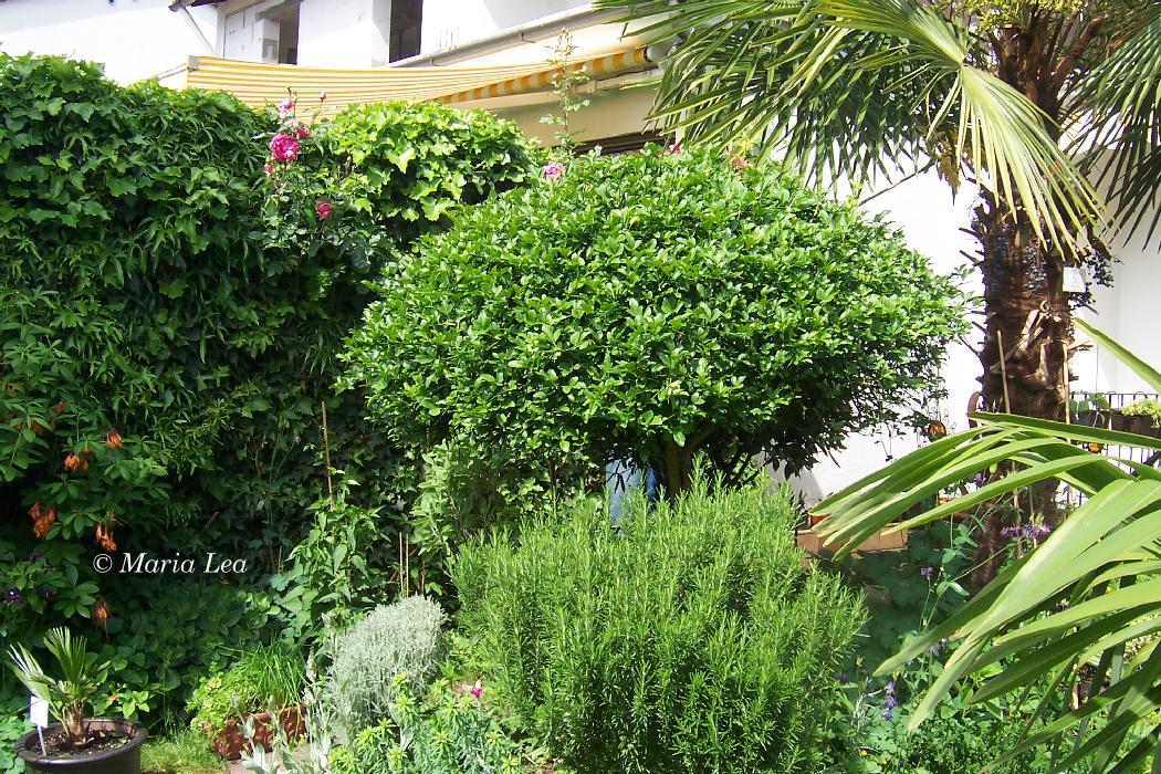 Der schirmartig getrimmte "Alt-Ponci" vor der Terrassen-Trachy, davor der Rosmarin.