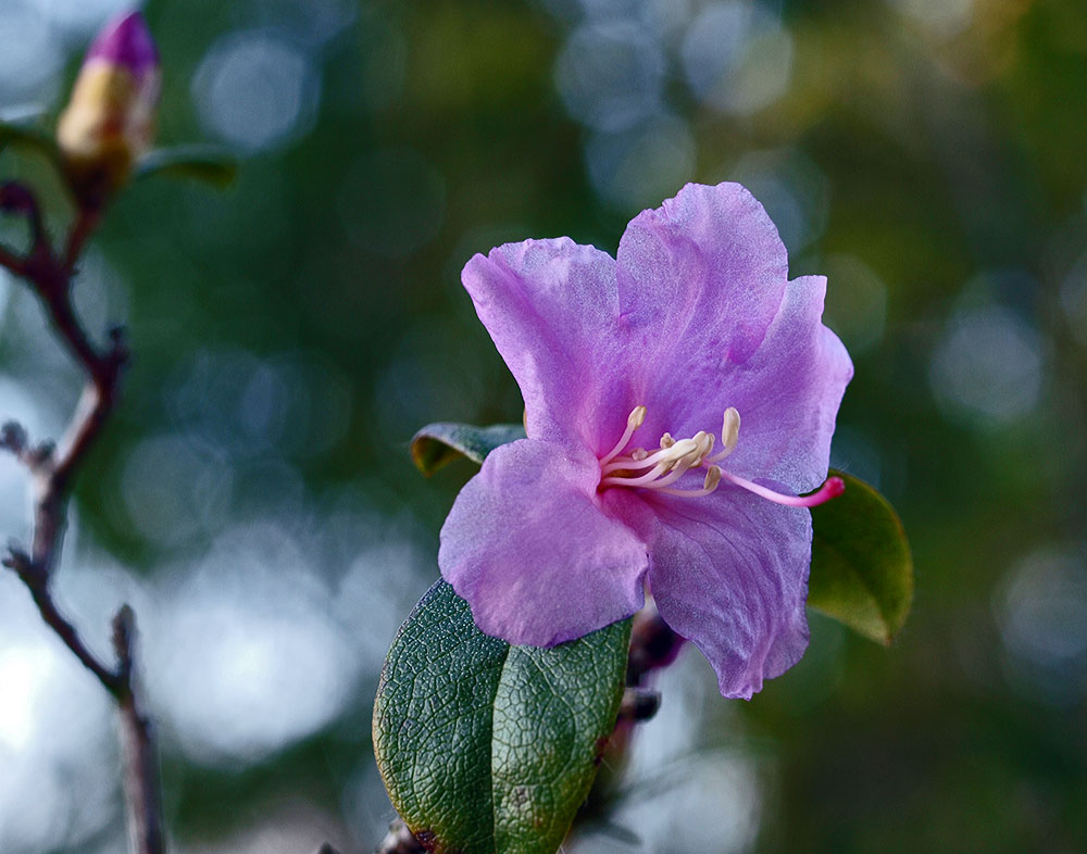 /*Rhododendron praecox*/ mit den ersten Blüten.