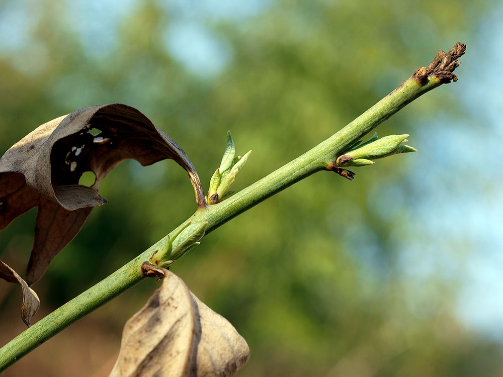 /*Romneya coulteri*/ treibt schon wieder am alten Holz,keine Schäden trotz 2 Wochen Frost zu verzeichnen.