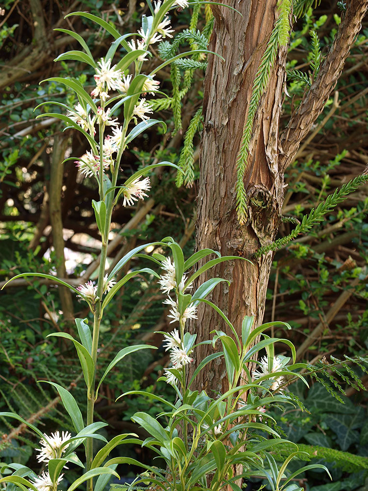 Blühende /*Sarcococca*/ vor dem Stamm von Cryptomeria araucarioides.