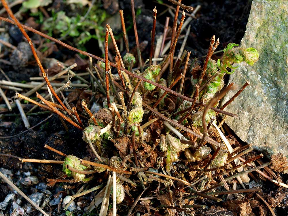 Der zuverlässige Farn/*Woodsia polystichoides*/ ist auch schon am Treiben.