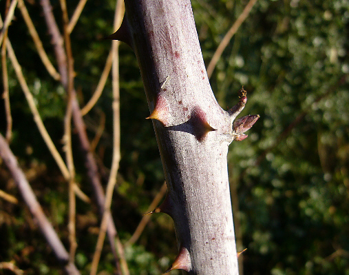 Hier Rubus cockburnianus mit seinen jetzt besonders auffallenden, mehr als daumendicken, weisslichen, etwa 3 m hohen Staemmen:
