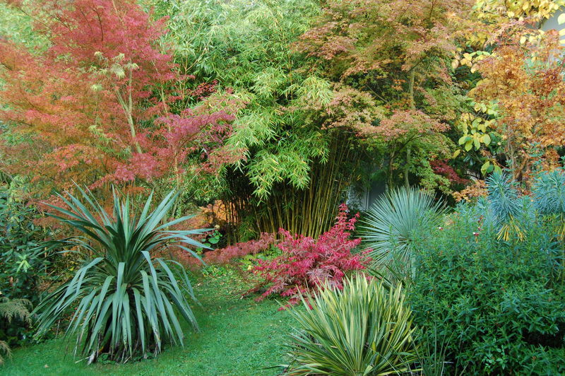 /*Acer palmatum Seiryu*/ li, Acer palmatum Shindeshojo re, vorne div. Yuccas (u.a.Y.filamentosa variegata)