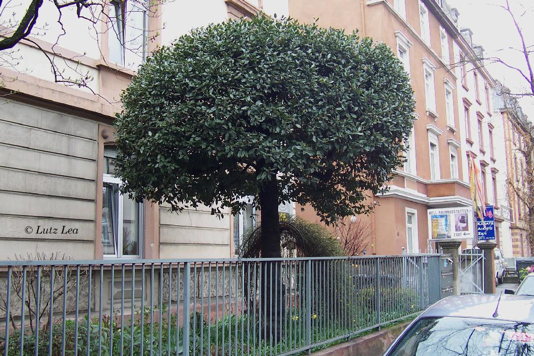 Aufgeastete, stark eingekürzte und zur Kugel (Schirmform) getrimmte Ilex in Ffm. Sachsenhausen.