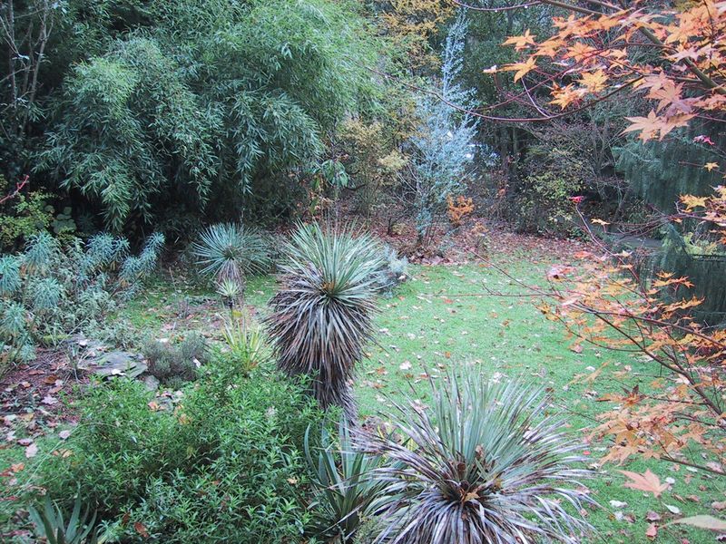 Die 3 eng Verwandten Yuccas (Nordmexiko) vor der riesigen Phyllostachys nigra Boryana-Gruppe