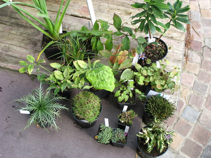 Hier ein Teil der Kleinigkeiten - für alle Gartensituationen etwas: Sukkulenten, Alpine, 2 Eryngium, 2 Tricyrtis mit bläulichen Blüten, die immergrüne Disporopsis fusco-picta, Podophyllum 'Kaleidoscope', 3 der noch recht raren asiatischen Epimedium, Cassiope lycopodioides, .............