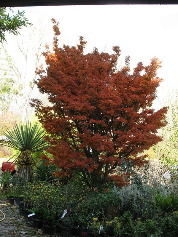 stellt sich zögerlich auch bei mir ein. Acer palmatum 'Shishigashira', der "Petersilienahorn" - Wegen seiner gekräuselten kleinen Blätter - ist leider ein sehr unsicherer Färber: mal färbt er gar nicht und die Blätter fallen dunkelgrün ab, mal wird er gelb, mal braun-orange oder, was mir am besten zusagt, ein feurigleuchtendes Weinrot, eventuell mit verschiedenen Rottönen durchsetzt. Aber danach sieht es dieses Jahr nicht aus!