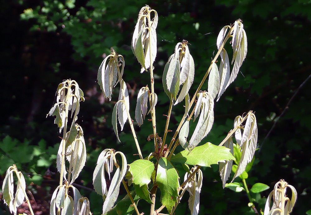 jedes Jahr das Gleiche: Der Neuaustrieb der immergrünen /*Quercus gilva*/ könnte als Grund zur Sorge wahrgenommen werden. Die jungen Blätter sehen verwelkt aus, und man hat den Eindruck, als sei die Sorgeneiche von irgendeiner Krankheit befallen. Aber es gibt keinen Grund zur Sorge: "Quercus gilva soll so". Die bleichen, hängenden Blätter werden später saftig grün und richten sich auf.