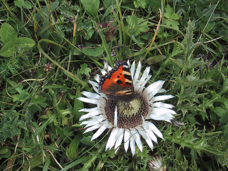 /*Carlina acaulis*/, die Silberdistel mit Vanessa urtica, dem Kl. Fuchs