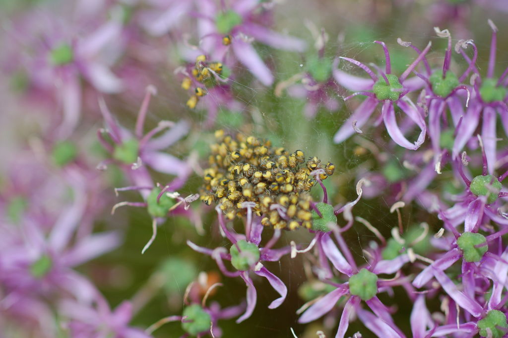 Auf /*Allium giganteum*/ haben sich massenweise, wuselige Spinnenkinder eingefunden AM#