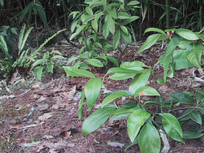 Ebenfalls ohne Fostschäden überstand /*Illicium henryi*/ diesen Winter. Im Hintergrund /*Pileostegia viburnoides*/ und eine Crispum-Form von Asplenium scolopendrium
