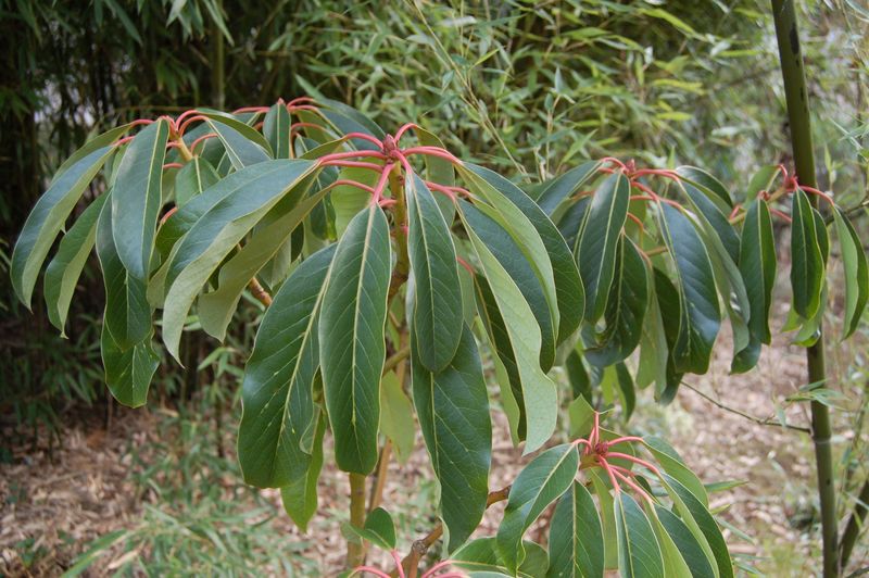 Wesentl. exotischer durch größere Blätter und rötl. Blattstiele :/*Daphniphyllum macropodum*/ vor Phyllostachys nigra Boryana