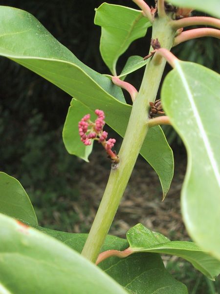 Leider etwas unscharf:die Blütentraube des immergrünen jap./chin. Baumes Daphniphyllum macropodum.