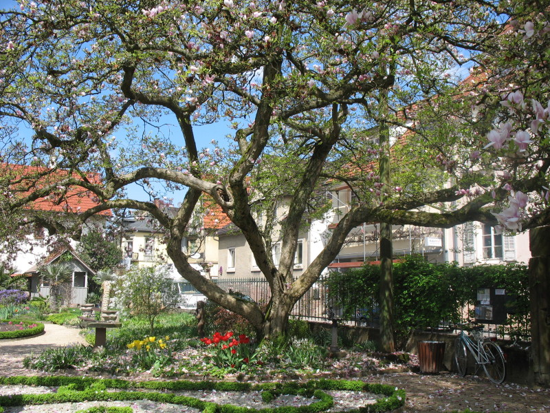 alte Magnolie. Gepflanzt vor ca 200 Jahren sollen die beiden Bäume zu den ältesten Magnolien nördlich der Alpen gehören.