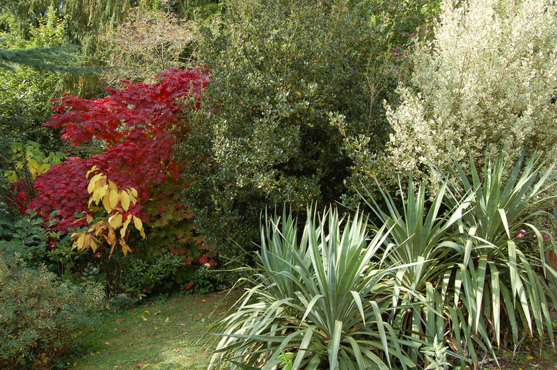 Ohne Sonne sieht's nur halb so schön aus:/*Acer japonicum Vitifolium*/ zusammen mit Acer pseudosieboldianum, von den gelben Blättern der Asimina deutlich kontrastiert.Re die beiden Immergrünen Quercus phillyreoides und der z.Zt. fast 3,5m hohe Rhamnus alaternus Argenteovariegatus