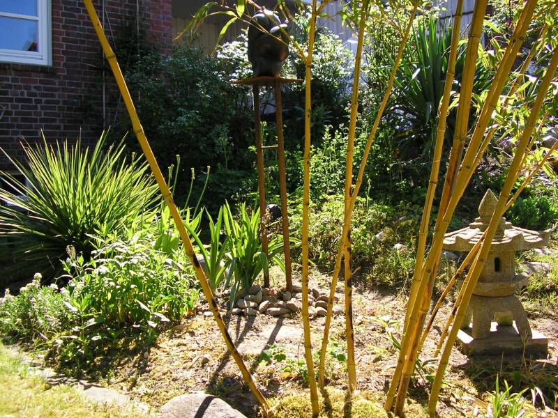 heute ruht auch die Arbeit im Garten. Die schon intensive Vormittagssonne leicht gefiltert durch das Laub von Phyllostachys aureocaulis.