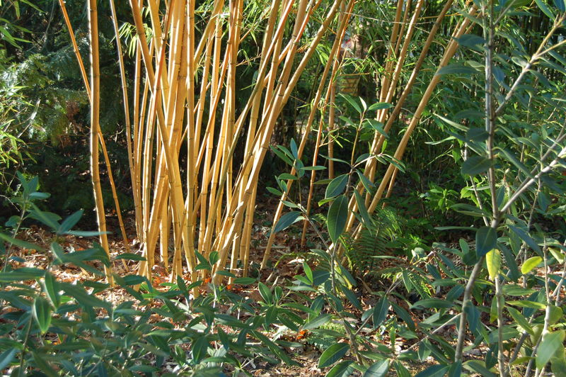vorne links die schmalblättrige Form (/*Osmanthus decorus angustifolius*/) und re die normale Form (latifolius).Im Hintergrund Phyllostachys vivax aureocaulis
