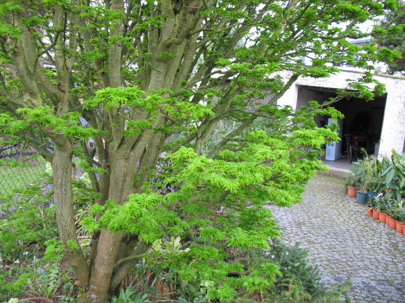 der Regen heute, auch wenn er kalt war, scheint meinen Acer palmatum 'Shishigashira' noch mal richtig im Austrieb gepuscht zu haben.