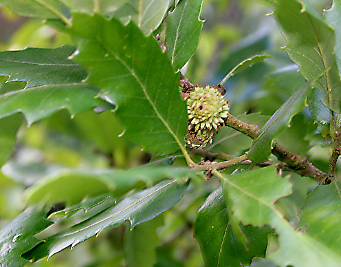 Ich habe kaum die Haelfte Deiner immergruenen Arten und nur eine zusaetzliche: Quercus macrolepis, die Wallonen-Eiche. Ich erwaehne sie hier nur der Vollstaendigkeit halber. Die Wallonen-Eiche ist nur halbimmergruen, hat unterseits silbrigweisse Blaetter und macht riesige, nach Behandlung essbare Eicheln (3 x 4 cm), die in einem stacheligen Becher stecken. Der ist auf dem hier beigefuegten Bild (aus dem Sommer!) im noch jungen Entwicklungsstadium erkennbar.