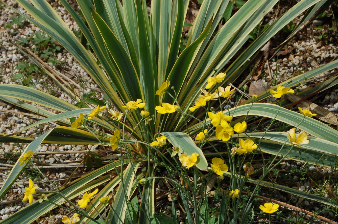 neben Yucca filamentosa Bright Edge: /*Ranunculus gramineus*/ #AM