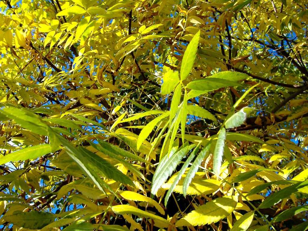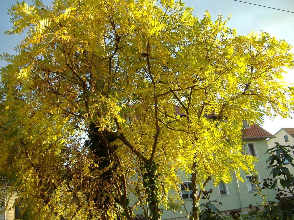 Hier noch ein Nachtrag zu /*Xanthoceras sorbifolia Bunge*/ gelb leuchtendes Herbstlaub in der herbstlichen Abendsonne: